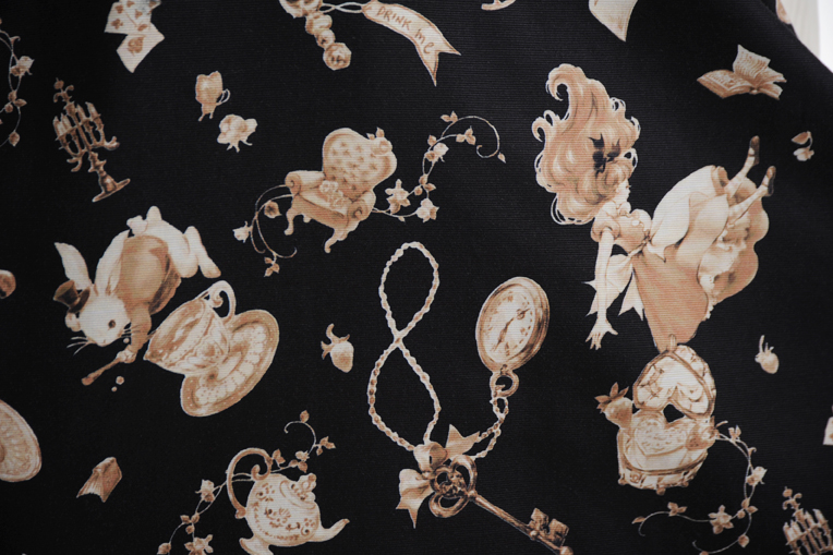 グログランの生地に。セピア色の夢のようにアリスやうさぎ、ケーキやティーセットなどのモチーフが浮かぶジャンパースカートです。 |